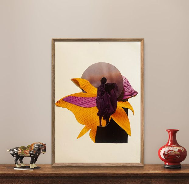Collage avec papier, sur papier blanc avec un grain lisse.